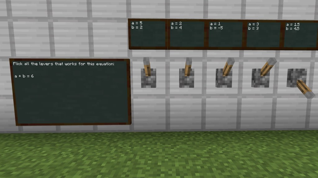 From there, there are various questions, either by talking to teacher NPCs or clicking on blocks. To keep it varied there is a room with a special lever combination lock. Unfortunately though the levers don’t reset, so once one person solves it, the door stays open. If I am in the world with the students, I change the levers back to the starting position before the next player arrives.