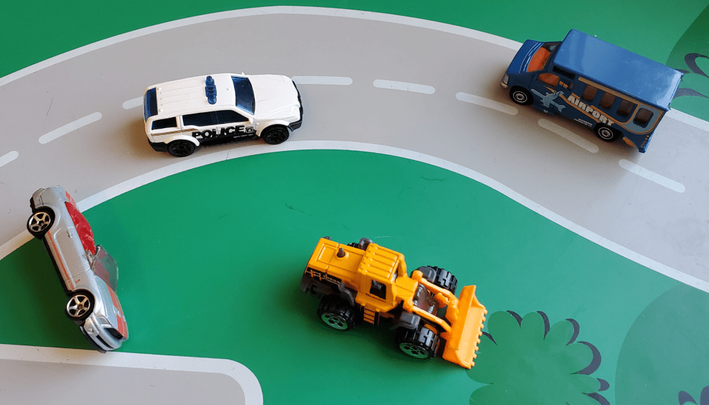 You would expect one student to spot the car on its side – take your time with this, which car? The one at the bottom? The yellow one? How do you know it is on its side? The Shuttle Bus only has two wheels, because I can only see two wheels. Is that right? How many wheels can you see? How many wheels can you not see?